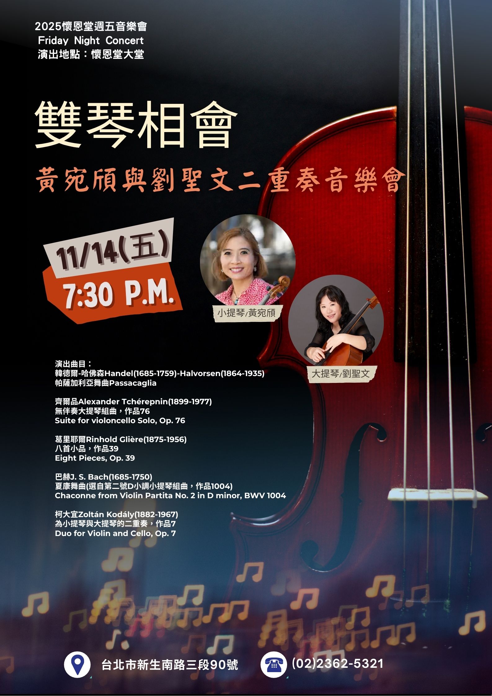 「週五音樂會」,是懷恩堂特別為南台北愛樂者所精心策劃與構想的一項創舉。基督教是一個喜歡歌唱的宗教,基督徒無論在喜樂或憂傷時總是以音樂來傾訴和表達;多年來,有一群懷恩人常一起共築一個音樂夢,期望能與台灣的愛樂者一起藉著音樂的翅膀共享上帝的盛宴!於是,「週五音樂會」逐漸成形,因為,座落在南台北大學林立文教社區的基督教浸信會懷恩堂,美麗而莊嚴的禮拜堂,頗具音樂廳的規模和水準,可以容納一千二百多人是一座城市型的教會。如果,能藉著懷恩堂現有之設備,既能提供青年音樂家一個自由演出的表演空間,又能推動台北南區音樂風。懷恩堂更能藉此為這塊地土盡一點心力,提供服務社會的機會和回饋社區,並藉著音樂與宗教改善社會善良風氣。